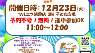 にこにこ広場 2025.12.23マルエツ朝霞店de親子にこにこ広場 今月の親子にこにこ広場は、大きな布芝居・わらべ歌とクリスマス工作です。 いつもの絵本が大きな布に描かれていて、迫力満点です! お楽しみのクリスマス工作の後は、サンタさんが来てくれるかも。 楽しみですね~ 参加費無料... 2025.12.02 にこにこ広場わらべうた工作